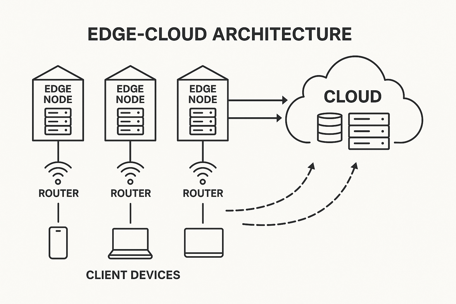 Figure: An edge-cloud architecture distributes computation across edge nodes (closer to devices) and cloud servers. Edge nodes perform local processing and storage, reducing latency for nearby clients, while the cloud provides global storage and scalability .