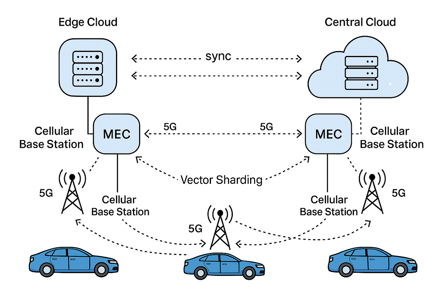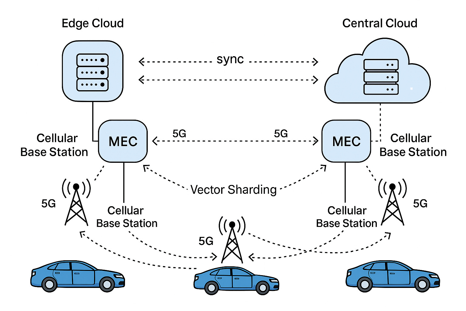 The underlying architecture (see figure) relies on 5G base stations, multi-access edge compute (MEC) servers, and a cloud backend. Vehicles (or their gateways) connect via NB-IoT/5G to MEC nodes which handle local data processing and caching . These MEC nodes are interconnected and linked to central cloud storage. Critically, the Vector Sharding layer sits atop this, moving data between cloud and MEC based on vehicle vectors. In effect, the network becomes an intelligent data fabric that anticipates each vehicle’s needs.